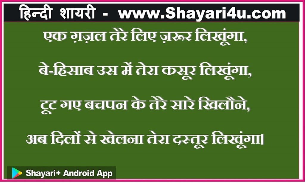एक ग़ज़ल तेरे लिए ShayariArt 8 years ago Home » Hindi Shayari » Sad Shayari » एक ग़ज़ल तेरे लिए Facebook Twitter Digg Pinterest एक ग़ज़ल तेरे लिए ज़रूर लिखूंगा,बे-हिसाब उस में तेरा कसूर लिखूंगा,टूट गए बचपन के तेरे सारे खिलौने,अब दिलों से खेलना तेरा दस्तूर लिखूंगा।