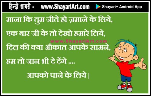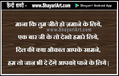 माना कि तुम जीते हो ज़माने के लिये, एक बार जी के तो देखो हमारे लिये, दिल की क्या औकात आपके सामने, हम तो जान भी दे देंगे आपको पाने के लिये |