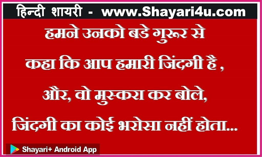 हमने उनको बडे गुरूर से ShayariArt 8 years ago Home » Hindi Shayari » Love Shayari » हमने उनको बडे गुरूर से Facebook Twitter Digg Pinterest हमने उनको बडे गुरूर से कहा कि आप हमारी जिंदगी है ,और, वो मुस्करा कर बोले, जिंदगी का कोई भरोसा नहीं होता…