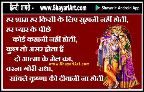 हर शाम हर किसी के लिए सुहानी नहीं होती,हर प्यार के पीछे कोई कहानी नहीं होती,कुछ तो असर होता हैं दो आत्मा के मेल का,वरना गोरी राधा, सांवले कृष्णा की दीवानी ना होती