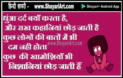 धुंआ दर्द बयाँ करता है,और राख कहानियां छोड़ जाती हैकुछ लोगों की बातों में भी दम नही होताकुछ की खामोशियाँ भी निशानियां छोड़ जाती हैं