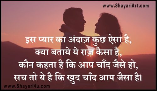 इस प्यार का अंदाज़ कुछ ऐसा है,क्या बताये ये राज़ कैसा है,कौन कहता है कि आप चाँद जैसे हो,सच तो ये है कि खुद चाँद आप जैसा है।